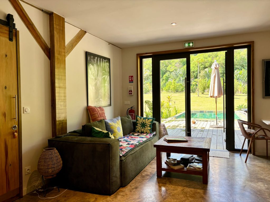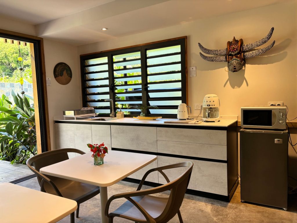 Le coin salon a été réaménagé en 3 pôles : deux coins détentes pour profiter des œuvres d’art et du calme et un espace repas avec kitchenette pour permettre de se poser tranquillement autour d’une boisson et d’un repas. La kitchenette se compose d’un évier, d’un plan de travail, d’un mini frigo, d’un micro-ondes, d’une cafetière, d’une bouilloire et de tous les couverts nécessaires.
